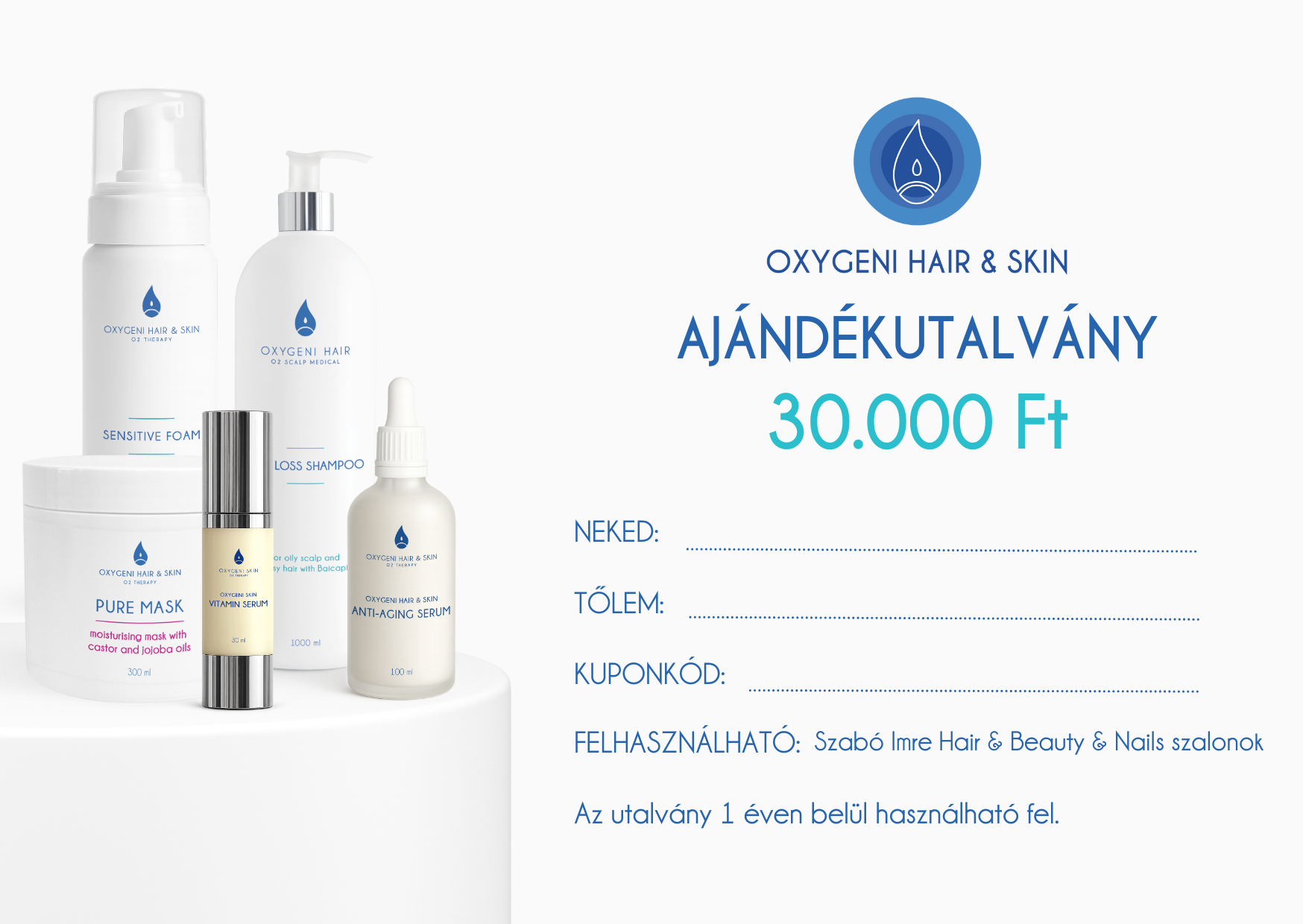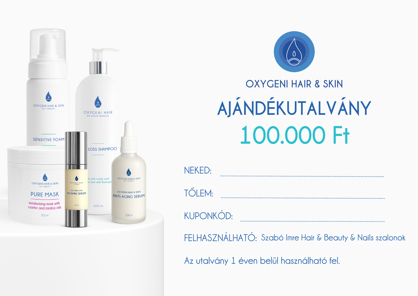- Oxigénterápiás utalvány: Kizárólag a Szabó Imre Hair & Beauty & Nails szalonokban válthatóak be. Az utalványok felhasználhatóak kezelésre és termékvásárlásra is.