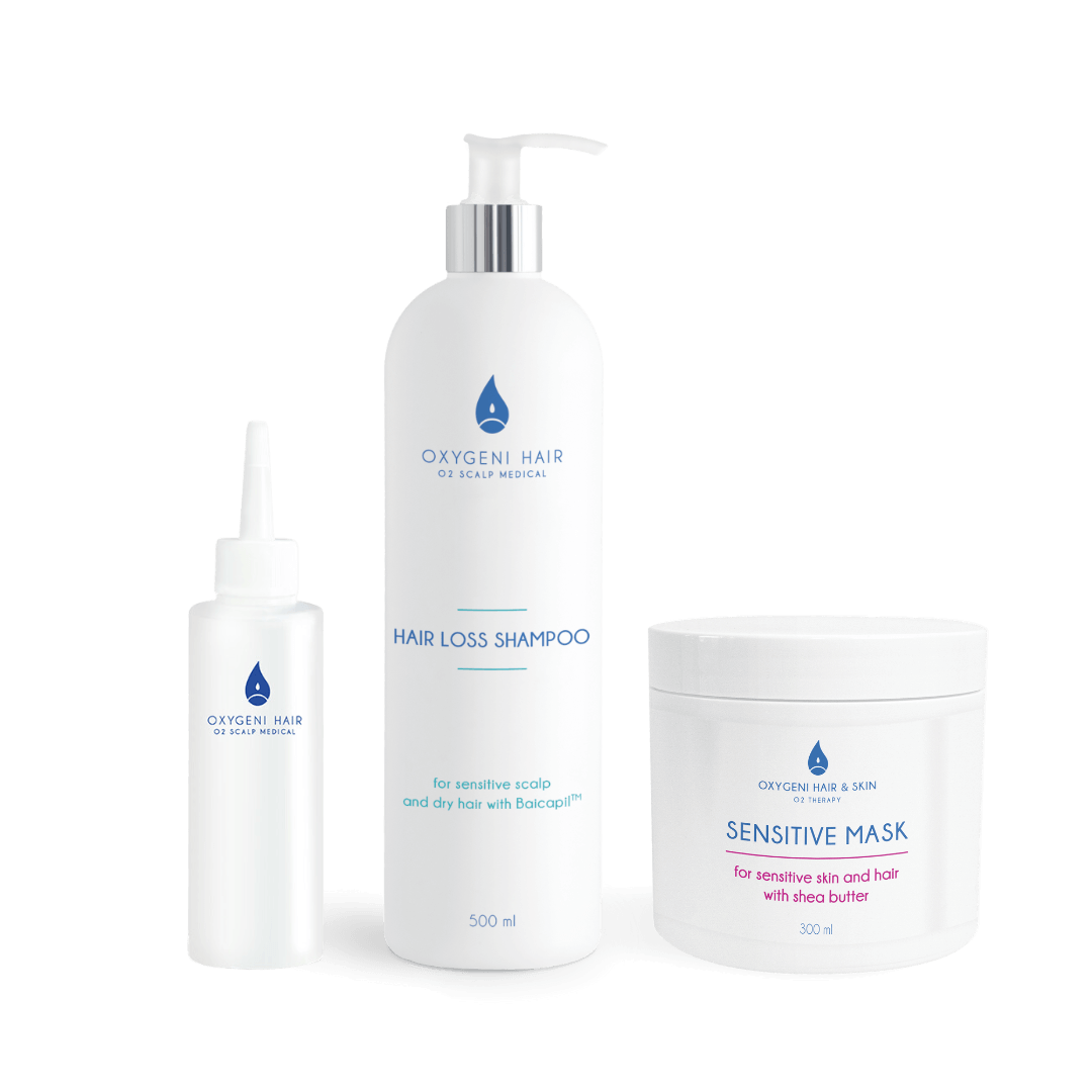 A Hair Loss Shampoo (500 ml sensitive) és a Sensitive Mask (300 ml) együttesen tisztít, nyugtat és regenerál — természetes összetevőkkel.