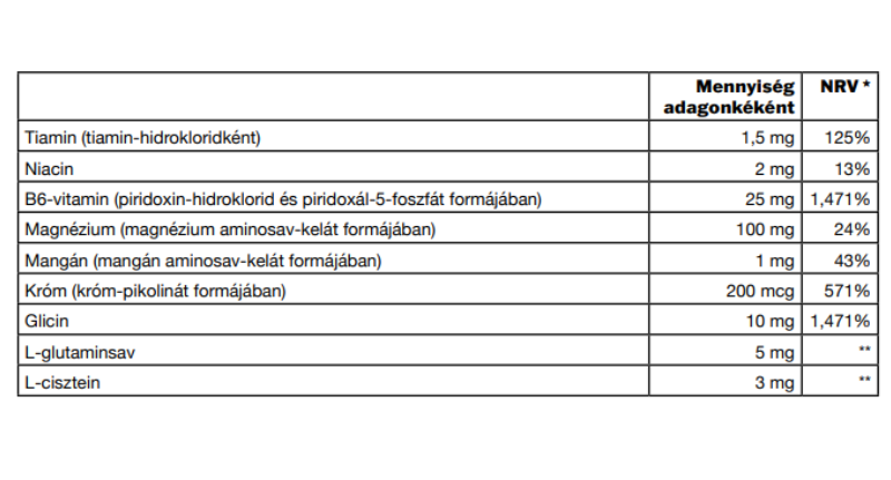 Ez a komplex formula magnéziumot, krómot, B6-vitamint, tiamint, niacint és mangánt tartalmaz, melyek együtt dolgoznak azért, hogy tested kiegyensúlyozottan működjön, és ne kelljen kompromisszumot kötnöd az egészséged érdekében.
